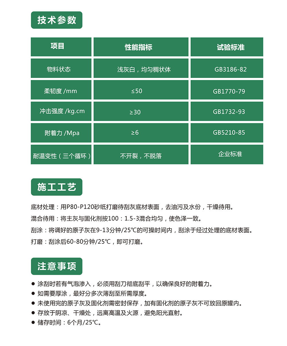 施工比例: 原子灰:固化剂=100:1.5-3(重量比) 注:可操作时间9-13分钟(依据固化剂的比例和温度的变化而不同)